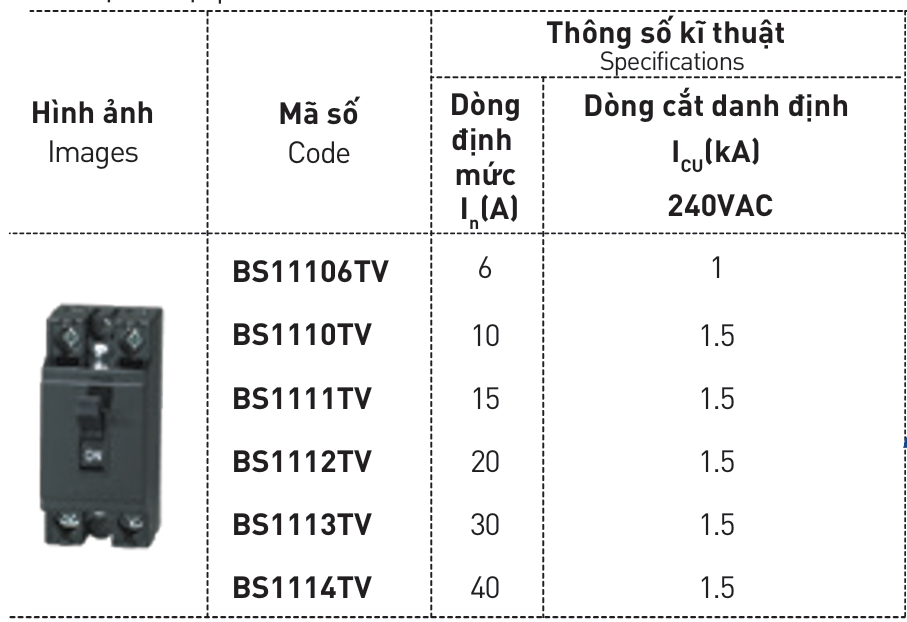 Dòng định mức ln(A): 6A, 10A, 16A, 20A, 25A, 32A, 40A